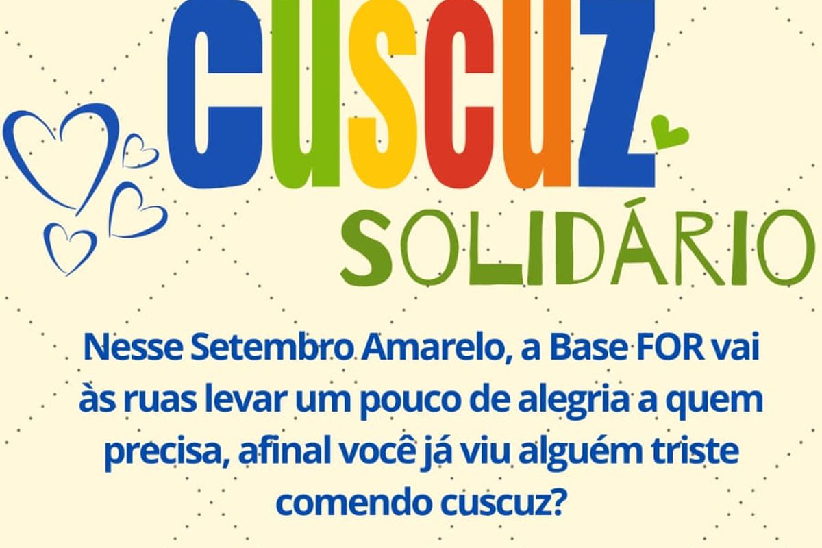 Nesse Setembro Amarelo, a Base FOR vai às ruas levar um pouco de alegria a quem precisa, afinal você já viu alguém triste comendo cuscuz?! Precisaremos de doações: cuscuz, salsicha, cebola, cheiro verde (coentro e cebolinha), molho de tomate, manteiga, talheres de plástico, marmitas, copos descartáveis e água mineral.